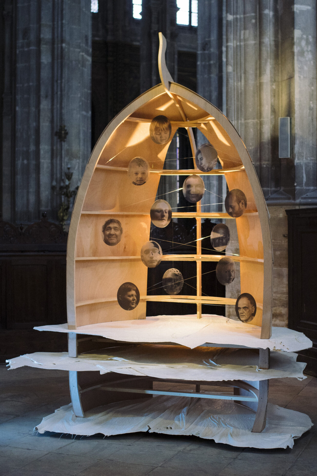 L’oeuvre représente une barque inachevée debout, tirée des eaux par une colombe en proue et dans laquelle flottent les portraits d’hommes, femmes et enfants d’aujourd’hui qui vivent en France et dont certains sont des réfugiés récemment installés à Paris.